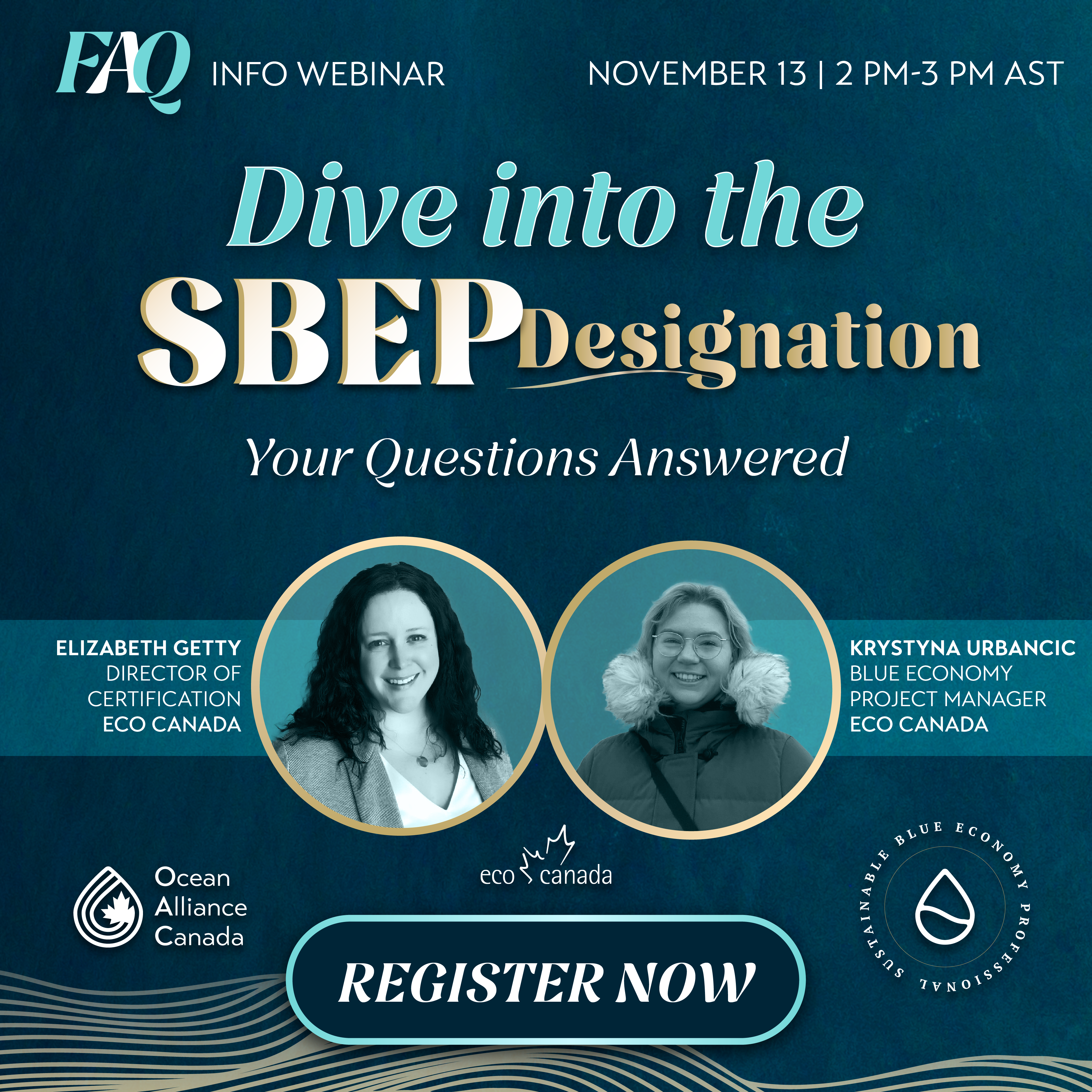 Explore how the Sustainable Blue Economy Professional (SBEP) Designation can elevate your career or strengthen your organization at our live SBEP Info Webinar. This interactive session unpacks the full designation process—from eligibility and assessment criteria to key benefits for professionals, employers, and the ocean sector. Hear directly from ECO Canada’s certification experts as they answer real questions from the community and share insights into how SBEP recognition supports Canada’s growing blue economy. Whether you’re just starting your career or advancing within the field, this session offers practical guidance and clear next steps to help you make waves with purpose.