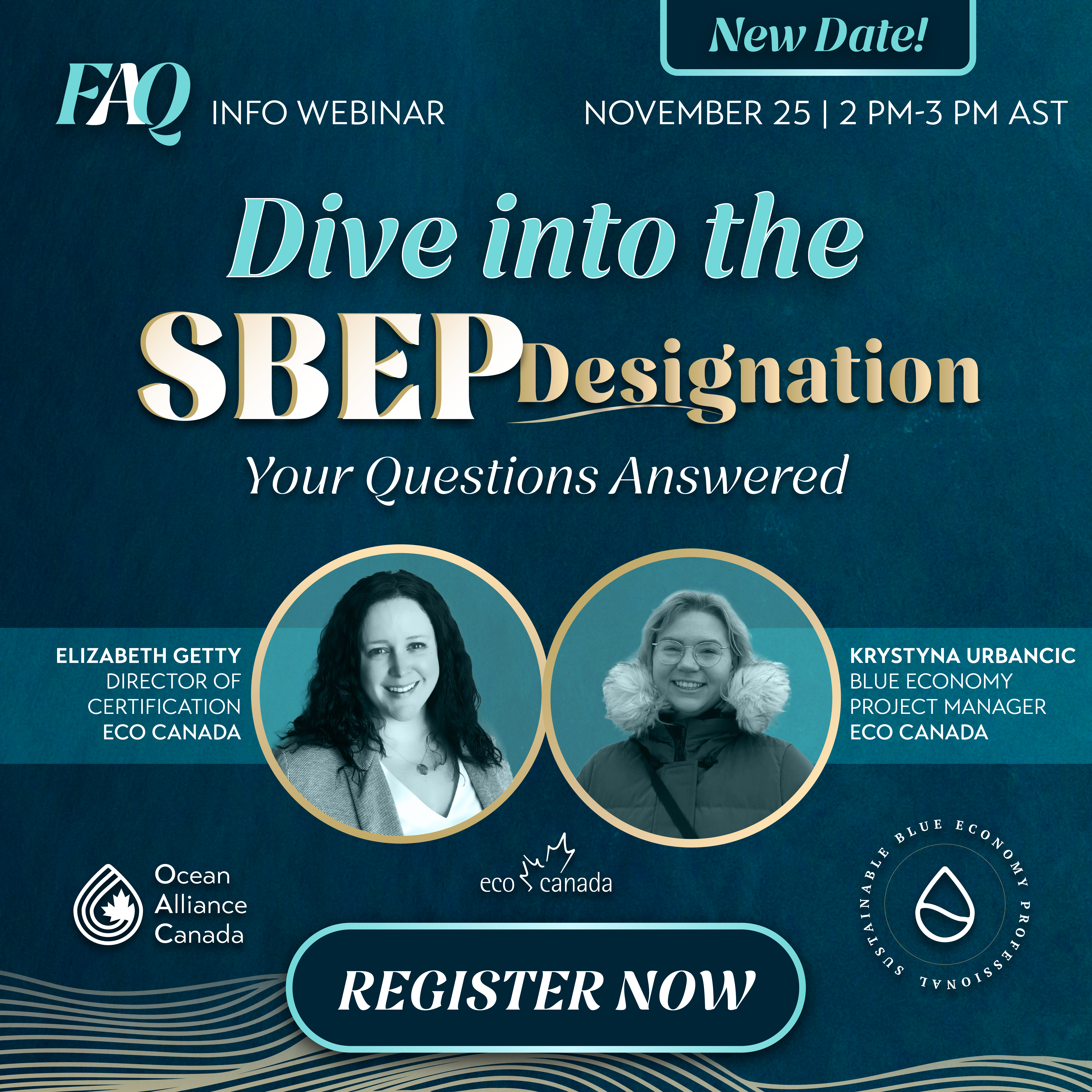 Explore how the Sustainable Blue Economy Professional (SBEP) Designation can elevate your career or strengthen your organization at our live SBEP Info Webinar. This interactive session unpacks the full designation process—from eligibility and assessment criteria to key benefits for professionals, employers, and the ocean sector. Hear directly from ECO Canada’s certification experts as they answer real questions from the community and share insights into how SBEP recognition supports Canada’s growing blue economy. Whether you’re just starting your career or advancing within the field, this session offers practical guidance and clear next steps to help you make waves with purpose.